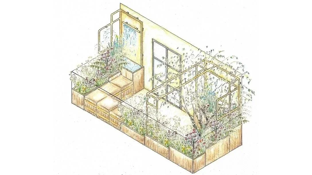 Copper pipe wings wrap the garden, sustaining the planting via misters that use minimal water.
